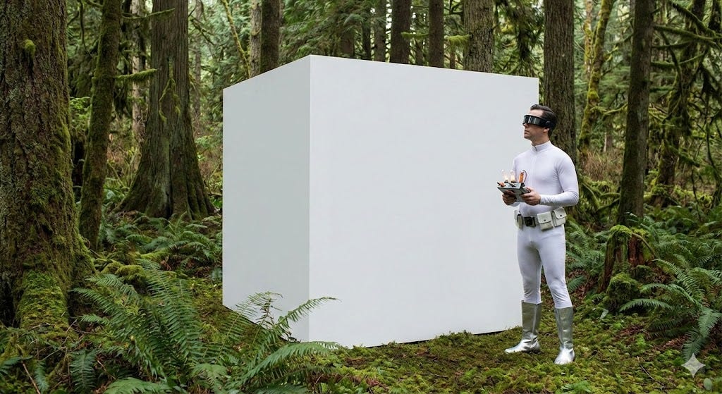 Just as I prepared to repeat myself he leaned over the edge of the seven foot tall white cube he was perched on and reached out to me. I recoiled, which I consider justifiable, not knowing what to expect from a stranger sitting on a white cube in the middle of a national forest preserve.